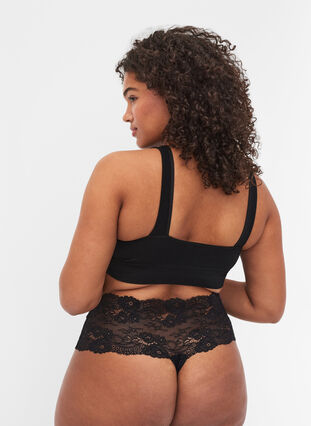 Kobiece stringi o regularnym stanie. Sa wykonane z miekkiego materialu i maja ladna, szeroka koronke w pasie.