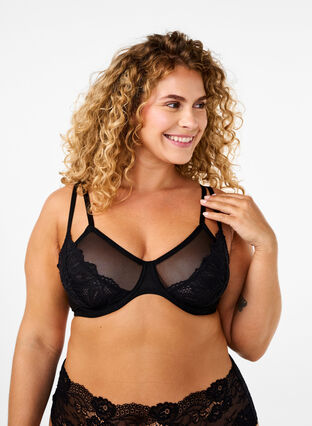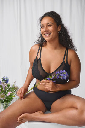 Biustonosz na fiszbinach z dwiema osobnymi warstwami: wewnetrzna z przewiewnej siateczki i zewnetrzna z eleganckiej koronki. Dwa waskie ramiaczka z przodu lacza sie w szerokie, regulowane ramiaczko z tylu.