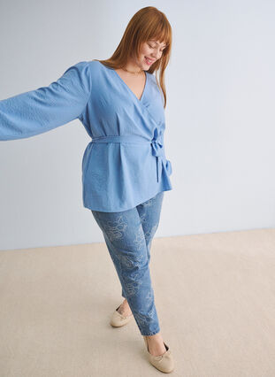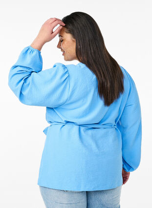 Piekna bluzka w kobiecym stylu z dekoltem w szpic V i dlugimi bufiastymi rekawami z elastycznymi mankietami. Jest wykonana z lekkiego materialu zawierajacego 51 % poliestru z recyklingu i jest wiazana w talii paskiem, co nadaje jej regularnemu krojowi kopertowy wyglad.