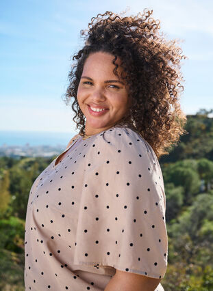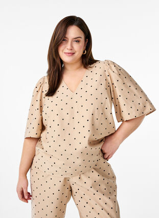 Bluzka z delikatnym wzorem w kropki, wykonana z miekkiej i luksusowej mieszanki materialów zawierajacej 85 % wiskozy Livaeco™. Ma luzne krótkie rekawy, dekolt w szpic i regularny krój.
