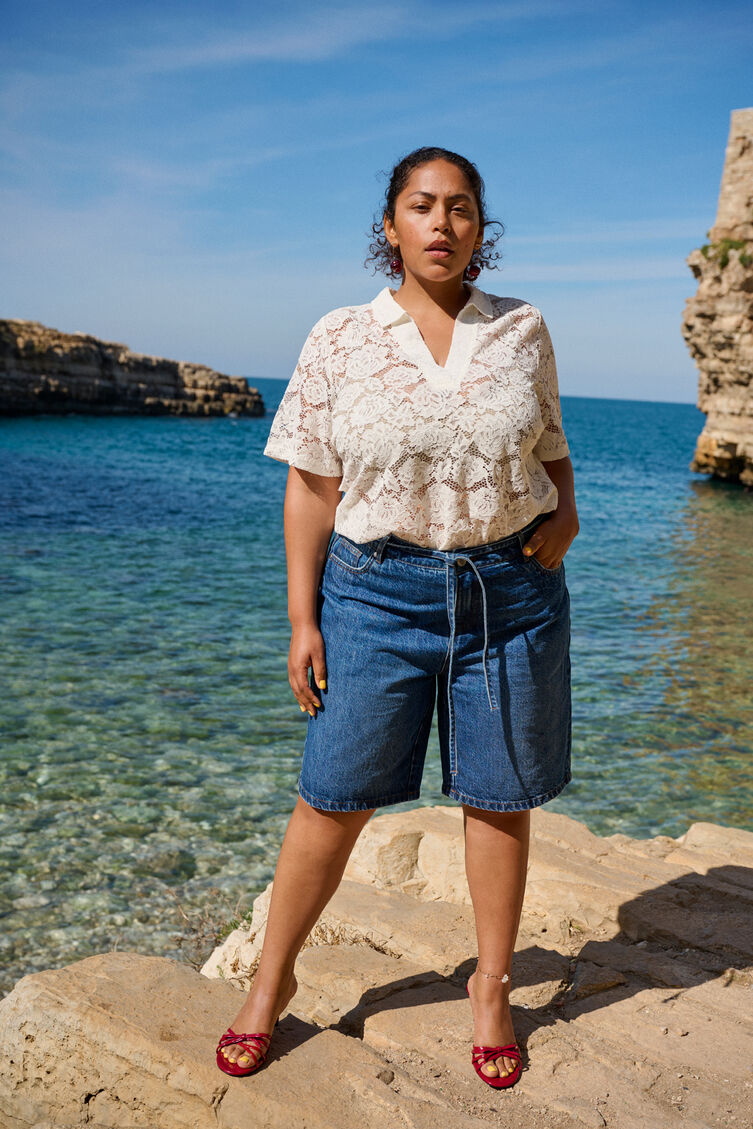 Dopasowane szorty jeansowe z wysokim stanem i szlufkami, wykonane w 100 % z bawelny Maja klasyczne kieszenie z przodu i z tylu, zdejmowany pasek oraz zapiecie na guzik i zamek blyskawiczny.