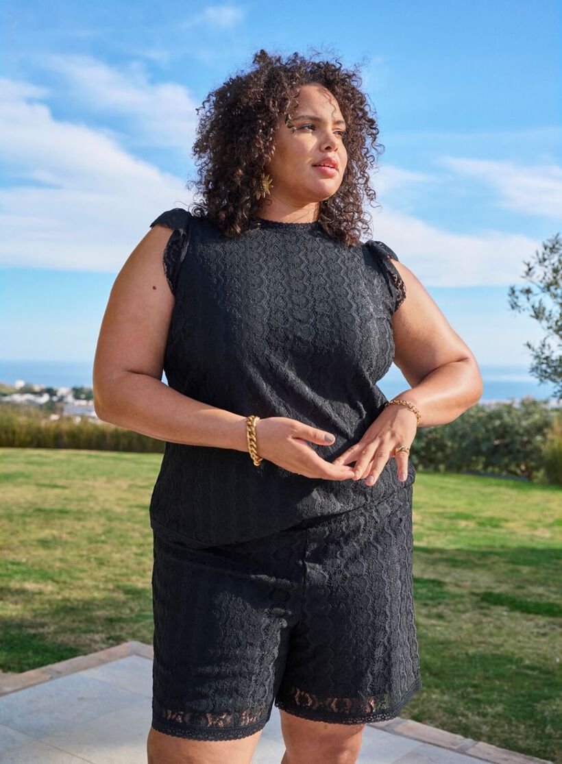 Kobiece koronkowe szorty z wysoka talia. Maja miekka podszewke i elastyczny pas, który zapewnia wygodne dopasowanie.