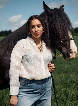 Koszula z lekkiego i przewiewnego materialu z wiskoza i delikatnym kwiatowym wzorem metoda ton w ton. Koszula ma regularny krój z klasycznym kolnierzykiem, pelne zapiecie na guziki i dlugie rekawy z mankietami.