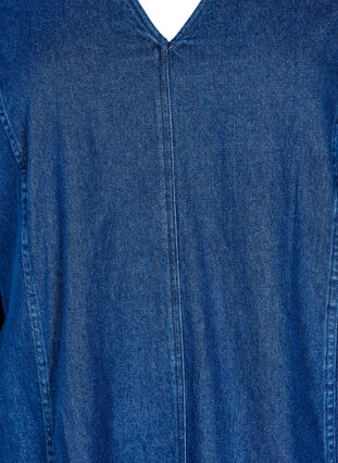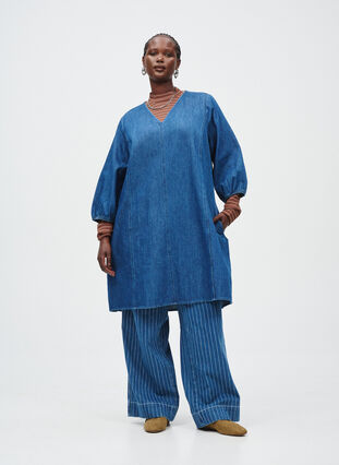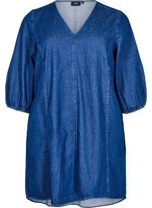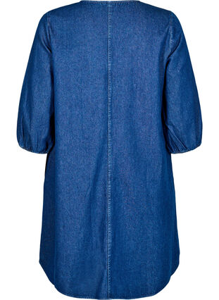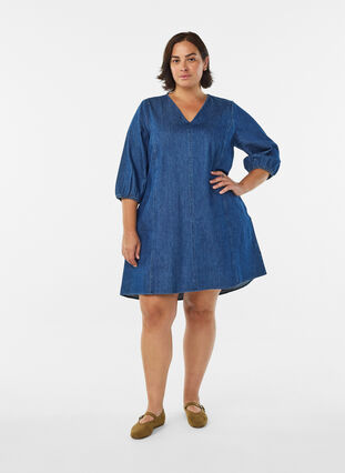 Krótka dzinsowa sukienka wykonana w 100 % z bawelny o regularnym kroju i ozdobnych szwach z przodu i z tylu, nadajacych jej prosty i stylowy wyglad. Sukienka ma dekolt w szpic, boczne kieszenie i bufiaste rekawy 3/4 z elastycznymi mankietami.