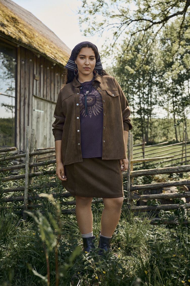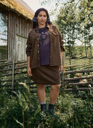 Krótka spódniczka ze sztucznej skóry zamszowej o wygodnym, elastycznym wykonczeniu. Spódniczka ma lekko trapezowy krój, zapiecie na zamek blyskawiczny z tylu oraz delikatna podszewke.