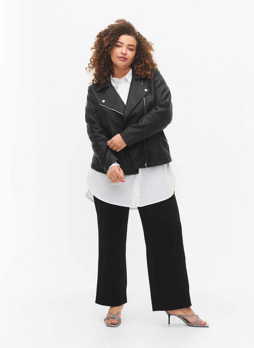 Fajna kurtka motocyklowa z imitacji skóry z zamkiem blyskawicznym. Kurtka ma ozdobne szwy, kolnierz i klapy oraz boczne kieszenie zapinane na zamek blyskawiczny.