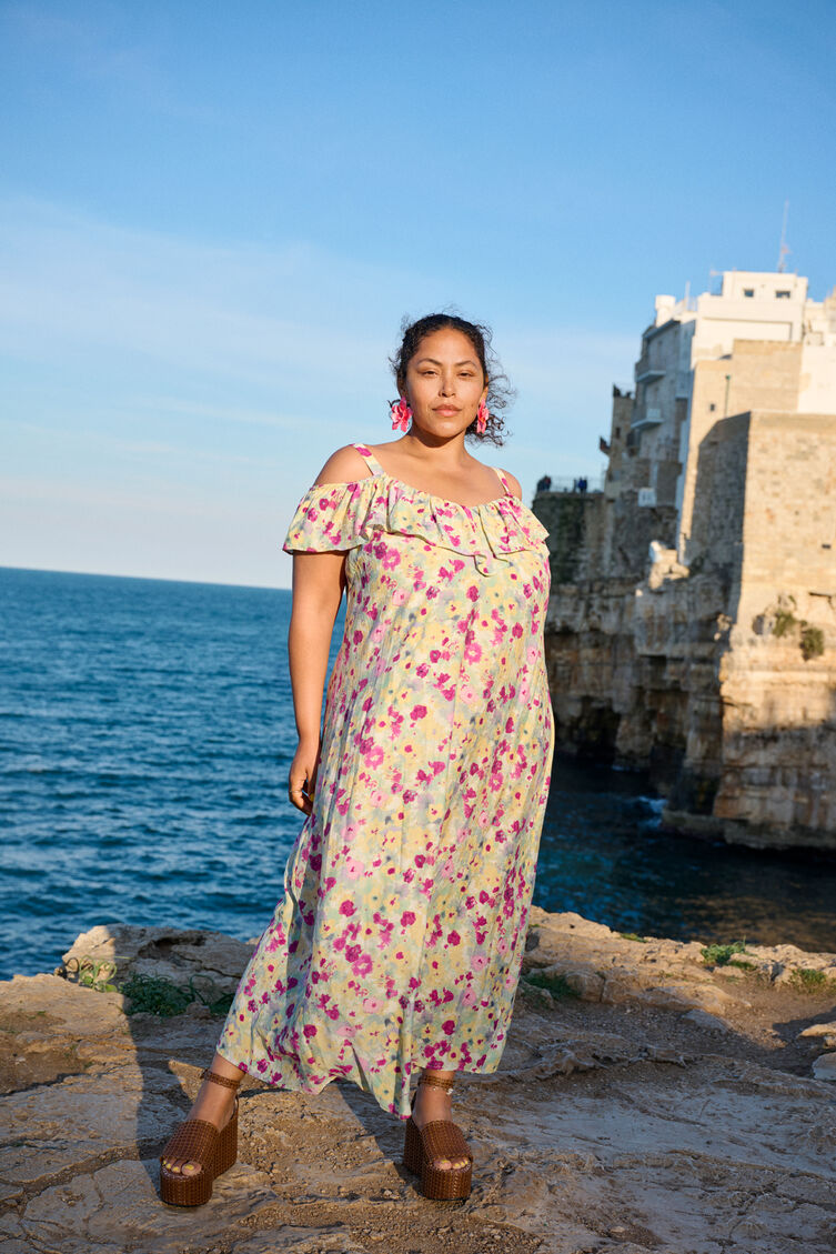 Letnia sukienka midi w ksztalcie litery A z waskimi, regulowanymi ramiaczkami i falbankami na ramionach. Sukienka wykonana jest z miekkiego i lekkiego materialu wiskozowego z kolorowym kwiatowym nadrukiem.