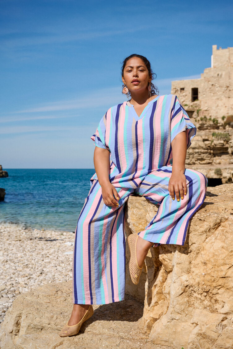 Kolorowe spodnie z miekkiej wiskozy z pieknym wzorem w paski. Spodnie maja wysoka talie z elastycznym paskiem, boczne kieszenie i wygodny krój z prostymi i przewiewnymi nogawkami, pieknie ukladajacymi sie od bioder w dól.