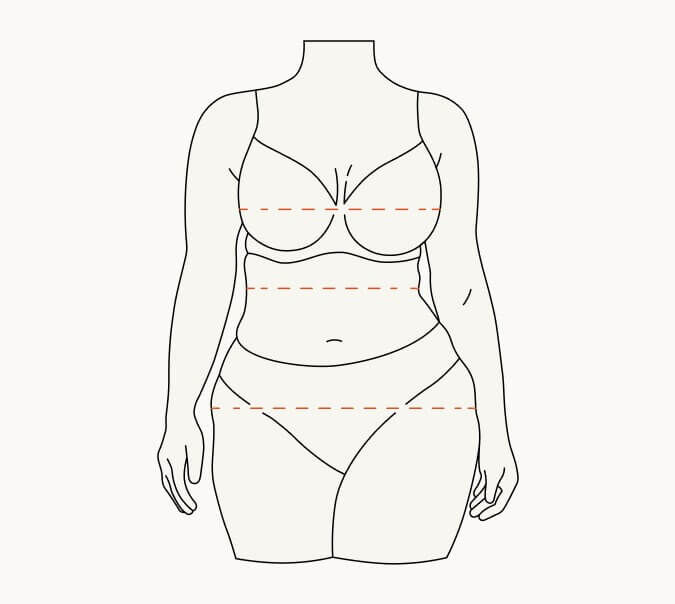 Kiedy chcesz znaleźć odpowiedni dla siebie rozmiar, najlepiej zacząć od dokładnego zmierzenia się. Podczas sprawdzania swoich wymiarów warto pozostawić dość luzu na wsunięcie palca między ciało a używany do pomiaru centymetr krawiecki. Dzięki temu, gdy będziesz nosić ubrania, będą one wygodne i nie będą ciasne. Interesują nas trzy punkty pomiaru, jak widać na poniższej ilustracji.