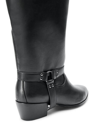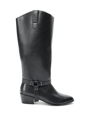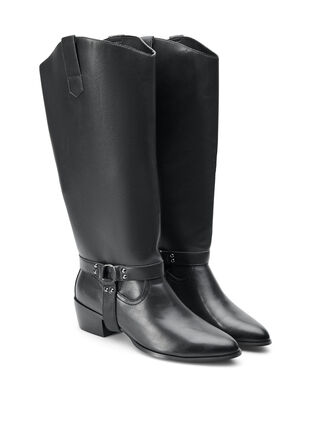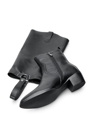 Dlugie, szerokie buty z wyjmowana cholewka, które mozna latwo dopasowac, aby stworzyc rózne stylizacje - od wysokich do kolan po eleganckie botki. Buty maja ponadczasowy design z elastycznymi panelami na zewnatrz, które zapewniaja dobre dopasowanie i elastycznosc, a zamek blyskawiczny po wewnetrznej stronie ulatwia zakladanie i zdejmowanie. Zdejmowany trzon ma dodatkowa szerokosc i mozna go latwo odlaczyc i zapiac za pomoca klamry i metalowego pierscienia, zapewniajac, ze trzon pozostanie bezpiecznie na miejscu.