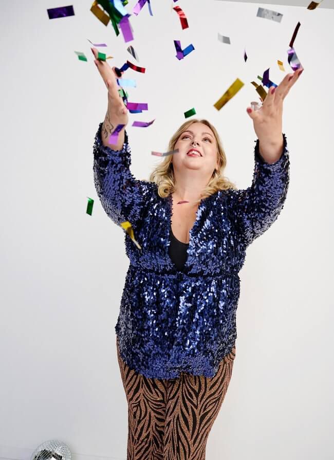 „Dla mnie ubrania imprezowe są czymś, co wydobywa moją zabawną, zalotną i seksowną stronę, a ja uwielbiam błyskotki i brokat! Chcę czuć się seksownie i zwykle zakładam coś, co podkreśla moje krągłości i pokazuje trochę ciała”.