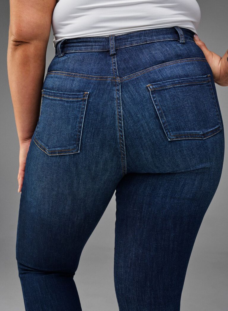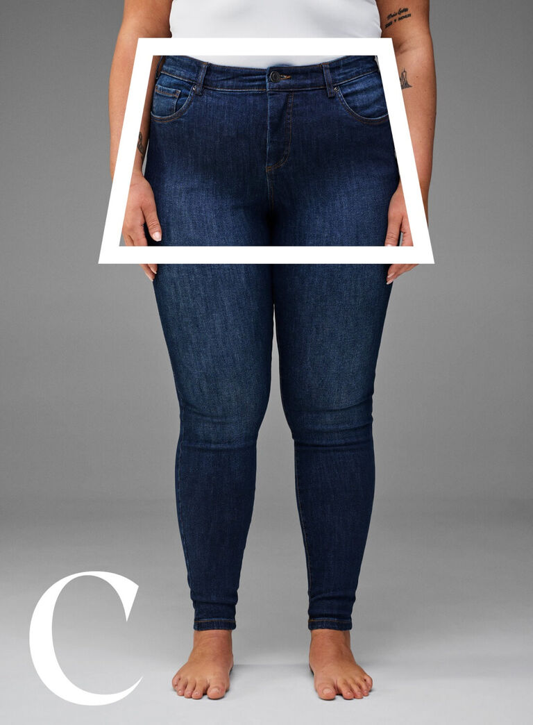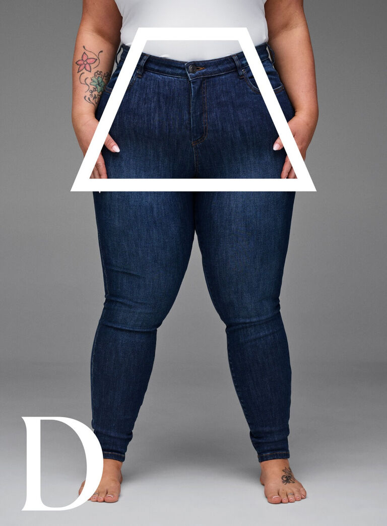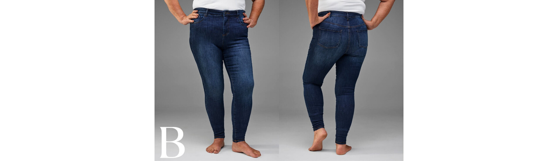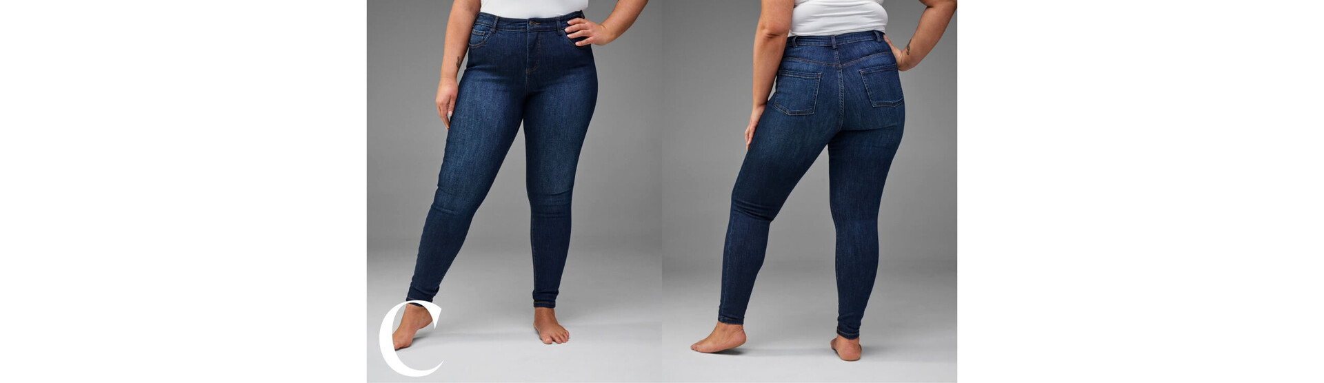 Idealnie byłoby, gdyby para jeansów o kroju super slim fit przylegała blisko ciała, ale każde ciało jest inne, więc oczywistym jest, że nie każdej kobiecie pasują te same spodnie. Opracowaliśmy te jeansy tak, aby pasowały do 3 różnych kształtów ciała, dzięki czemu jeszcze więcej osób może wybrać wygodną i dobrze dopasowaną parę jeansów slim fit.