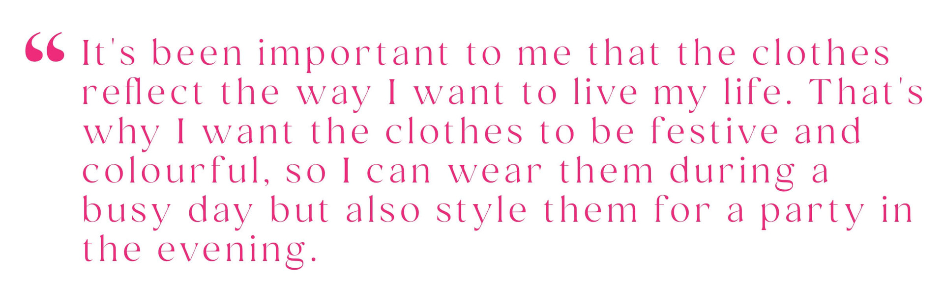„Ta kolekcja to spełnienie marzeń z dzieciństwa. Dzięki niej chcę dotrzeć do wszystkich tych, które jedną stopą stoją w różu, a drugą w czerni. Marzę, aby natchnąć większą liczbę kobiet do wybrania kolorowej sukienki i odważnej zabawy z ubraniami.”