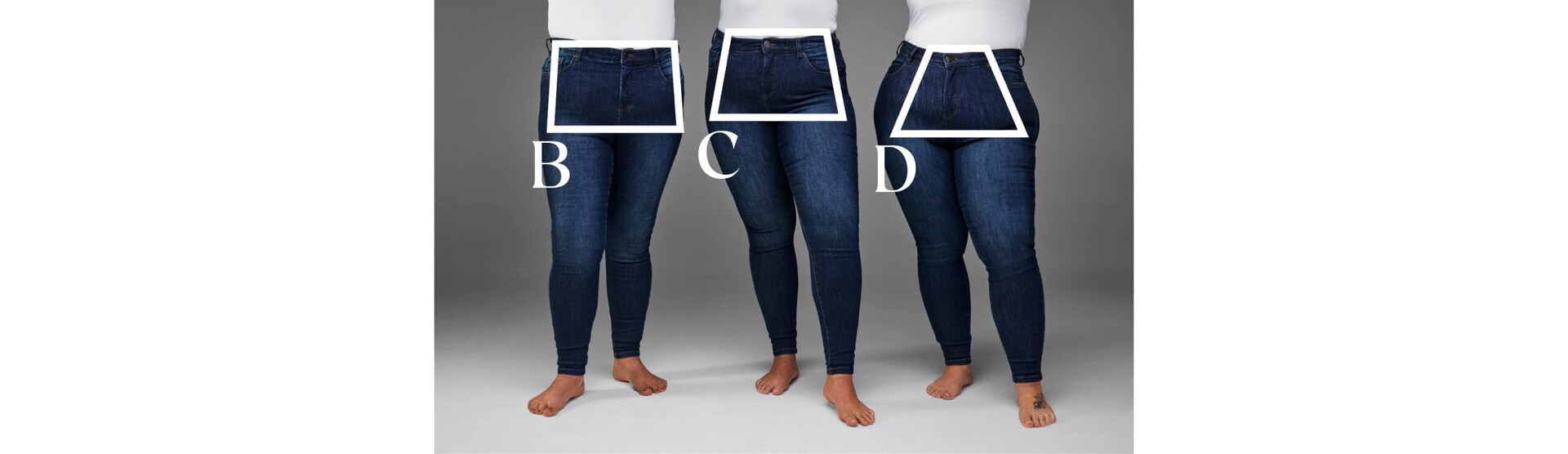 Zasadniczo wszystkie trzy rodzaje jeansów mogą pasować na kobietę o szerokich biodrach. Różnica między spodniami polega na różnicy w szerokości bioder i talii. Jeśli masz talię, która jest znacznie węższa niż biodra, zalecamy rozmiar D. Jeśli różnica w szerokości jest umiarkowana, powinnaś wybrać rozmiar C, podczas gdy niewielka różnica między obwodami talii i bioder pozwoli Ci znaleźć najlepszy krój w rozmiarze B. Więcej o 3 różnych krojach możesz przeczytać tutaj.